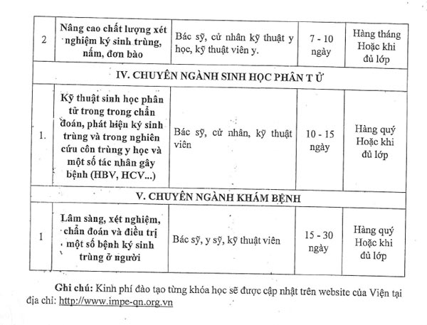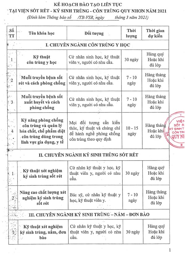 Viện Sốt rét - Ký sinh trùng - Côn trùng Quy Nhơn trân trọng thông báo và kính đề nghị Lãnh đạo các Sở Y tế, Trung tâm kiểm soát bệnh tật, Trung tâm Y tế dự phòng, và các đơn vị y tế trên địa bản các tỉnh, thành phố có nhu cầu đào tạo gửi công văn đề nghị và danh sách học viên dự kiến (mẫu phụ lục-được đính kèm phía dưới thông tin này) về Trung tâm Đào tạo Viện Viện Sốt rét - Ký sinh trùng - Côn trùng Quy Nhơn để tập hợp mở lớp.