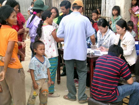 Đoàn tiến hành khám bệnh và lấy lam màu tìm ký sinh trúng sốt rét cho người dân tại thực địa |