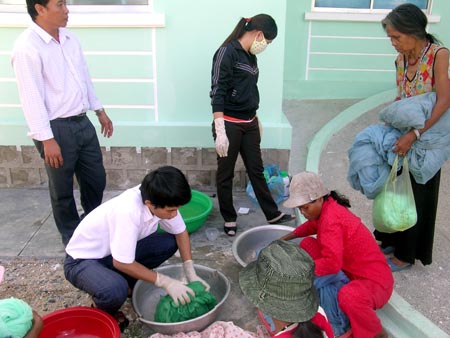 Cán bộ Trung tâm Y tế huyện, xã cùng học viên tẩm màn hóa chất diệt muỗi cho người dân |