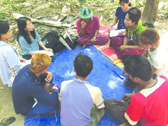 Một nhóm người cạo mủ cao su đang thử nghiệm quần áo tẩm chất xua ở bang Mon.