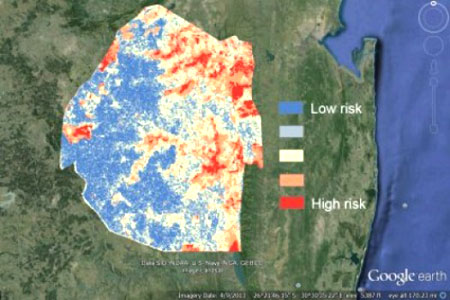 Một mẫu bản đồ về nguy cơ sốt rét ở Swaziland trong mùa truyền bệnh sốt rétsử dụng dữ liệu từ 2011-2013.