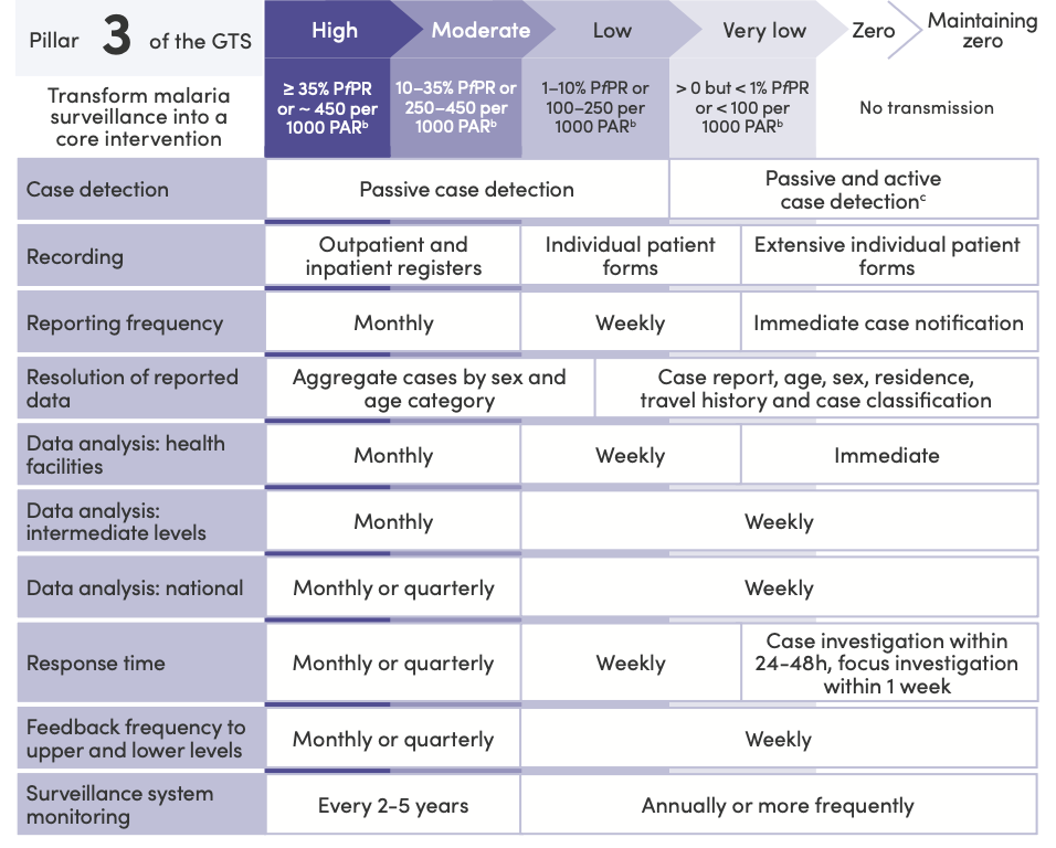 Tổ chức Y tế Thế giớikhẳng định rằng giám sát sốt rét không chỉ là một hoạt động thu thập dữ liệu, mà phải được coi là một can thiệp y tế công cộng cốt lõi. Trong Chiến lược kỹ thuật toàn cầu phòng chống và loại trừ sốt rét 2016-2030 (Global Technical Strategy-GTS), giám sát được xếp cùng nhóm ưu tiên với các trụ cột như phòng chống véc tơ và điều trị.Khung GTS cập nhật 2021 tiếp tục nhấnmạnh: “Transform malaria surveillance into a core intervention”-nghĩa là biến giám sát từ một công cụ hỗ trợ thành một biện pháp trực tiếp tác động đến kết quả sức khỏe cộng đồng. Ba trụ cột chính đã được TCYTTGnhấn mạnh bao gồm: