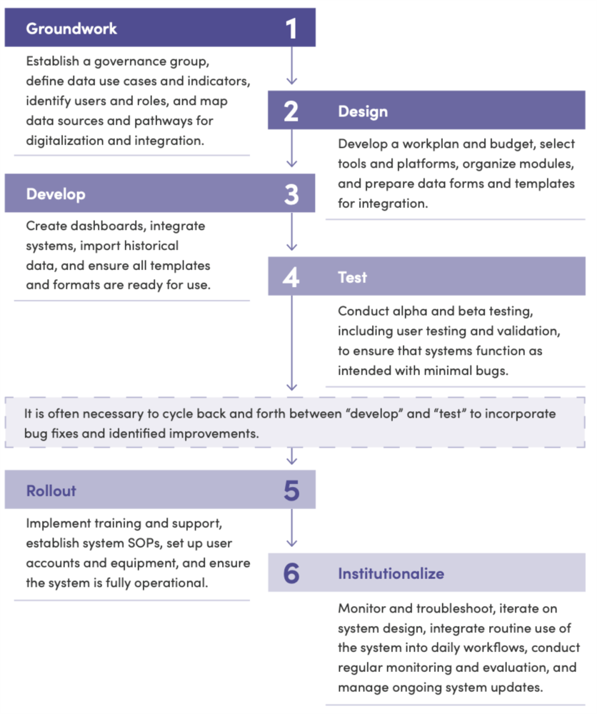 - National Malaria Data Repository (NMDR): là một kho dữ liệuquốc gia dành riêng cho sốt rét, cho phép tích hợp dữ liệu từ nhiều nguồn khác nhau (HMIS, điều tra cộng đồng, sentinel entomology, khí hậu, TES, dữ liệu di biến động dân cư…). TCYTTG mô tả lộ trình xây dựng NMDR theo 6 bước, từ khâu chuẩn bị, thí điểm đến thể chế hóa và duy trì.