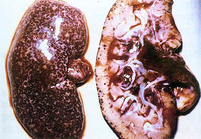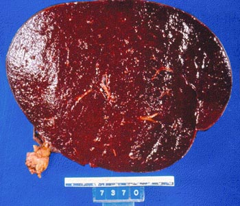 [3] Tắc nghẽn các mạch máu do quá trình tăng sản hệ lưới nội mô, dẫn đến cục nghẽn bít tắt và nhồi máu tại chỗ. Điều này đưa đến xuất huyết dưới vỏ và vùng liên thuỳ của lách và có thể bóc toàn bộ vỏ lách, gây xuất huyết nặng hơn ở vỏ lách. Hậu quả vỡ lách bị phù nề này sẽ toác ra.