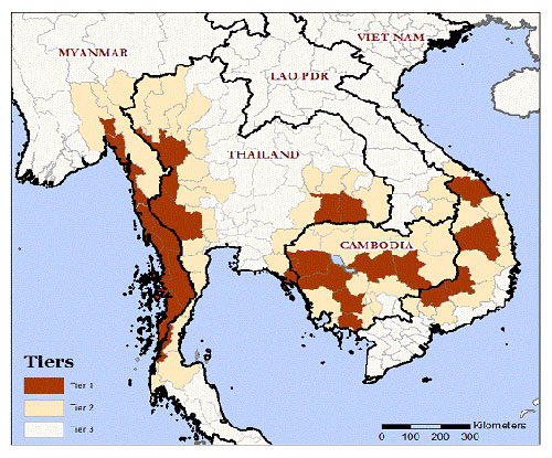 •Vùng III (Tier III): Khu vực có sốt rét P. falciparum nhưng không có bằng chứng về kháng artemisinin. Các biện pháp phòng ngừa và chuẩn bị ở khu vực này cần tập trung tăng diện bao phủ bằng các biện pháp phòng chống sốt rét chuẩn.