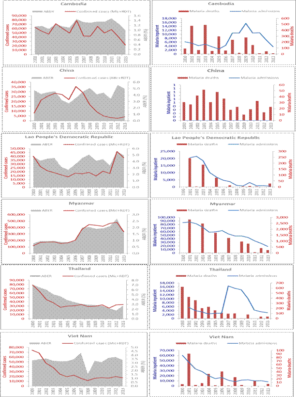 Dân số nguy cơ, báo cáo các ca mắc, ca chết do sốt rét và xu hướng bệnh kể từ năm 2000 được trìnhbày trong bảng A2.1. Ở Campuchia, số ca mắc sốt rét đã giảm. Tại Lào, số ca sốt rét báo cáo đã tăng do sốt rét bùng phát (hình 2). Sự gia tăng số lượng các ca sốt rét được báo cáo trong những năm gần đây là do công tác báo cáo toàn diện, đầy đủ hơn ở Campuchia, Myanmar và Thái Lan