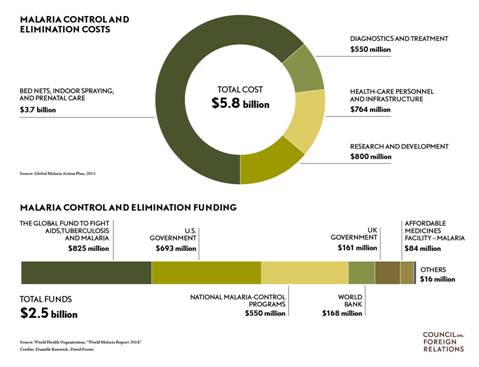 Liên Hiệp Quốc (UN) cam kết "làm giảm và đảo ngược" (halt and reverse) lan truyền sốt rét nhưmột phần của MDGs được công bố vào năm 2000 và nguồn tài trợ toàn cầu cho việc phòng chống và loại trừ bệnh sốt rét đã tăng từ 130 triệu đô la (USD) trong năm 2000 lên đến2,7 tỷ USD năm 2013. Trong năm 2005, Tổng thống Mỹ George W. Bush phát động Sáng kiến sốt rét của Tổng thống Hoa Kỳ (President's Malaria Initiative_PMI), gia tăng nguồn tài trợ của Mỹ cho phòng chống và điều trị sốt rét hơn 1,2 tỷ USD trong vòng 5 năm. Tổng thống Barack Obama tiếp tục thực hiện sáng kiến, đầu tư gần 5,8 tỷ USD trong PMI từ năm 2009 đến 2016. Theo Gates Foundation, tiêu diệt sốt rét vào năm 2040 sẽ có giá khoảng 90 tỷ đến120 tỷ USD. WHO cho rằng kinh phí hàng năm cần phải có 6,4 tỷ đô la nhiều hơn mức gấp đôi hiện nay vào năm 2020 để làm giảm tỷ lệ mắc và tử vong sốt rét khoảng 40% trên toàn cầu. Các nhà biện hộ (Advocates) cho rằng tiêu diệt có thể cứu được 11 triệu mạng người và mang lại khoảng 2 nghìn đô la trong sản xuất và tiết kiệm cho hệ thống y tế vào năm 2040. Theo WHO, giảm số lượng người tìm kiếm sự chữa trị trong khu vực công ở vùng cận Saharan châu Phi do sốt rét từ năm 2001 đến 2014 tiết kiệm được 900 triệu đô la trong chi phí y tế (tổ chức này ước tính việc điều trị sốt rét ở vùng cận Saharan châu Phi có chi phí mỗi năm gần 300 triệu đô la).