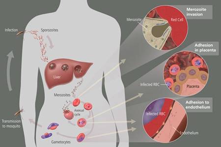 Chu kỳ phát triển của ký sinh trùng sốt rét trải qua 2 vật chủ là muỗi sốt rét (Anopheles) và người, người mắc bệnh sốt rét do bị muỗi cái Anophles nhiễm ký sinh trùng sốt rét đốt,sau đó khoảng 1 tuần khi muỗi hút máu bữa ăn lần sau các ký sinh trùng này hòa trộn với nước bọt của muỗi và được truyền cho người bị đốt. Ký sinh trùng sốt rét (Plasmodium) được truyền sang người qua muỗi cái Anopheles (female Anopheles mosquitoes) di chuyển qua máu người bị nhiễm bệnh tới gan và phát triển nhân lên trong tế bào gan, sau đó xâm nhập và phá hủy các tế bào hồng cầu trong cơ thể người gây nên những cơn sốt rét do đó trong điều trị cần chú trọng diệt thể vô tính (asexual form) của ký sinh trùng sốt rét trong giai đoạn này. Ngoài lan truyền tự nhiên qua muỗi Anopheles, ký sinh trùng sốt rét cũng có thể được truyền qua truyền máu (transmitted through blood transfusion), cấy ghép nội tạng (organ transplant), sử dụng chung bơm kim tiêm có dính máu (shared use of needles or syringes contaminated with blood) hoặc lây truyền từ mẹ sang con trước hay trong quá trình sinh nở gọi là “sốt rét bẩm sinh" (congenital malaria).