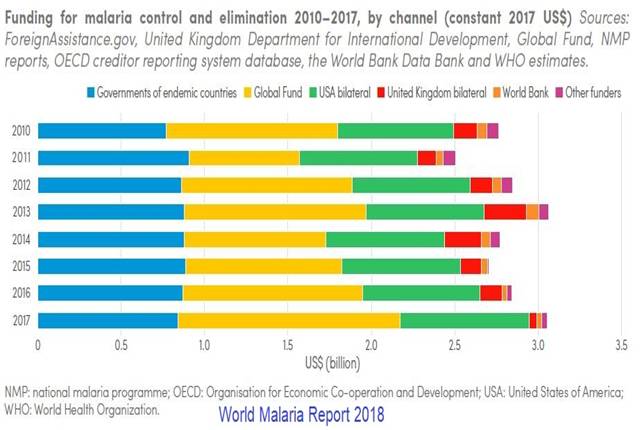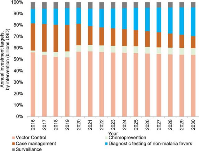 Trong năm 2017, ước tính có 3,1 tỷ USD đã được đầu tư vào các nỗ lực PC & LTSR do chính phủ các nước có lưu hành sốt rét (SRLH) và các đối tác quốc tế một số tiền cao hơn con số được báo cáo trong năm 2016. Gần ba phần tư (2,2 tỷ USD) đầu tư vào năm 2017 được dành cho khu vực châu Phi, tiếp theo là khu vực Đông Nam Á (300 triệu USD), châu Mỹ (200 triệu USD) và Đông Địa Trung Hải và Tây Thái Bình Dương (mỗi khu vực 100 triệu USD).