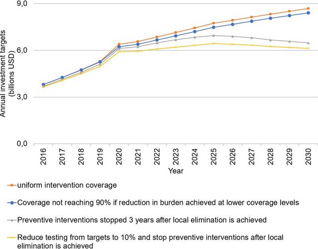 Để đạt được các mục tiêu vào năm 2030, ước tính kinh phí dành cho SR hàng năm cần tăng lên ít nhất là 6,6 tỷ USD mỗi năm vào năm 2020. Tăng cường đầu tư vào phát triển và nghiên cứu bệnh SR là chìa khóa để đạt được các mục tiêu. Trong năm 2016, 588 triệu USD đã được dành cho lĩnh vực này, chiếm 85% nhu cầu hàng năm ước tính cho nghiên cứu và phát triển. Mặc dù kinh phí nghiên cứu và phát triển cho các loại vaccine và thuốc SR giảm trong năm 2016 so với năm 2015 nhưng đầu tư vào các sản phẩm phòng chống vector gần như tăng gấp đôi từ 33 triệu USD lên 61 triệu USD.