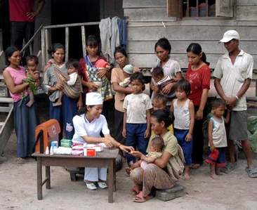 Cán bộ y tế hướng dẫn cho đồng bào uống thuốc chữa sốt rét |