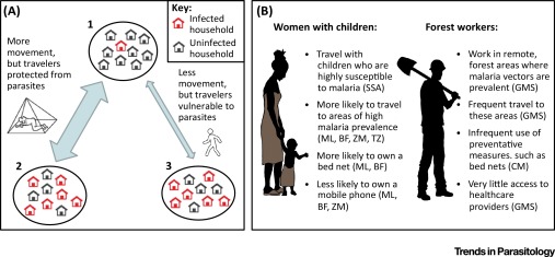 Đặc điểm của các nhóm di biến động chính bao gồm tính dễ bị ảnh hưởng bởi các vết đốt của muỗi, tần số di chuyển, nguồn gốc, nơi đến tại thời điểm đó ký sinh trùng xuất hiện nhiều và sự tiếp cận hạn chế tới các cơ sở y tế. Tại vùng GMS, đã nổi lên ký sinh trùng kháng thuốc phối hợp có Artemisinine (ACTs), các nghiên cứu chỉ ra những công nhân đi rừng là nhóm biến động cao chủ yếu có liên quan đến sự lan truyền sốt rét [12 (Hình 1B). Các véc-tơ sốt rét chính tại Đông Nam Á có liên hệ với môi trường rừng và các công nhân đi rừng thường xuyên di chuyển tới các khu vực này thường không có các biện pháp bảo hộ. Họ cũng có sự tiếp cận tương đối hạn chế với các dịch vụ y tế có nghĩa là khi bị nhiễm, họ có xu hướng bị nhiễm trong thời gian lâu dài là cơ sở để WHO khuyến nghị nên tập trung các biện pháp can thiệp vào nhóm đối tượng này để ngăn ngừa sự lan rộng ký sinh trùng kháng thuốc ACT [4]. Tại vùng Cận hoang mạc Sahara châu Phi, một khảo sát gần đây tại Mali, Burkina Faso, Zambia và Tazania [11] đã phát hiện rằng phụ nữ di chuyển với trẻ em là nhóm di chuyển duy trì lâu dài có liên quan tới lan truyền sốt rét (Hình 1B). Trong khi nhóm này có khả năng sở hữu màn ngủ cao ở một số quốc gia và họ cũng có khả năng rất cao di chuyển tới các khu vực thịnh hành sốt rét cao tại tất cả các nước được khảo sát. Trẻ em đi cùng họ đặc biệt dễ bị ảnh hưởng của sốt rét và có hệ miễn dịch chưa phát triển đầy đủ làm nhóm người này đóng vai trò lớn trong việc phân tán ký sinh trùng. Khảo sát tương tự cũng nhấn mạnh các công nhân trẻ tuổi là một nhóm di chuyển chính có liên quan đến sự phân tán ký sinh trùng tại Mali, chủ yếu là do các chuyến đi làm nông nghiệp xa nhà trùng với mùa mưa, mùa mà nguy cơ sốt rét lên cao nhất.