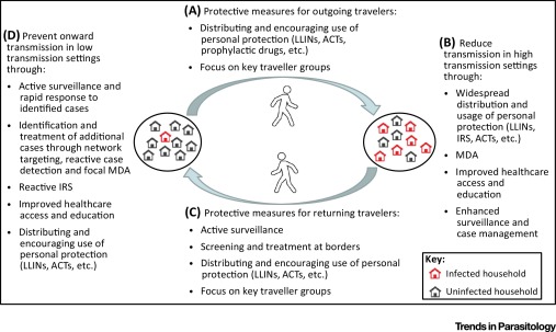 Chìa khóa để duy trì thành quả phòng chống sốt rét đạt được gần đây trong các bối cảnh lan truyền thấp và tiến đến loại trừ sốt rét chính là phát hiện những ca ngoại lai kia có thể được tối thiểu hóa ở bất kỳ giai đoạn nào trong số 4 giai đoạn di chuyển của con người: trong suốt di chuyển ra ngoài (during outgoing travel), tại bối cảnh lan truyền cao (at the high transmission setting (nguồn); trong khi di chuyển về (during return travel) và trong lúc trở về bối ảnh lan truyền thấp (upon return to the low transmission setting) [2] (Hình 2).