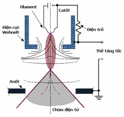 Điện tử đước phát ra từ nguồn phát điện tử. Nguồn phát có thể là ống phóng tia cathode (Cathode ray tube - CRT), hoặc dùng ống phát xạ trường (không dùng sợi đốt như ống CRT). Ưu điểm của ống phát xạ trường là không dùng sợi đốt nên có tuổi thọ rất cao, ít phải thay thế, nhưng giá thành cao gấp nhiều lần so với ống CRT.