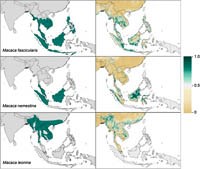 Ghi chú: Ba bản đồ bên (T) hiển thị phạm vi phân bố hiện tại các loài khỉ đuôi dài;