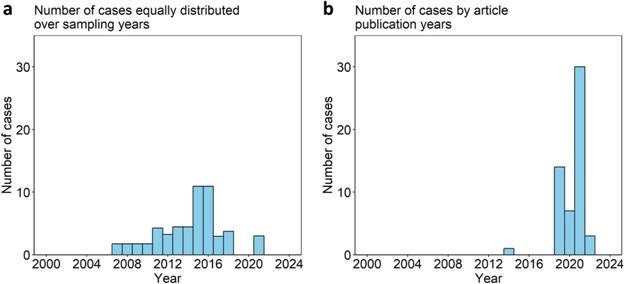 đồng đều trong các năm lấy mẫu (a) và theo năm xuất bản bài báo (b)
