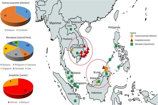 Trong số 5 loài ký sinh trùng sốt rét ở người, hai loài P. falciparum, P. vivax có tỷ lệ lưu hành cao nhất trên toàn cầu, trong khi đó các loài còn lại P. malariae, P. ovale curtisi và P. ovale wallikeri chiếm tỷ lệ thấp hơn và đặc biệt một số nơi xảy ra nhiễm phối hợp. Loài P. knowlesi, trước đây được xem là trên linh trưởng không phải người (non-human primate_NHP), giờ đây đã gây sốt rét ở người tại Malaysia và một số quốc gia khác. Các loài NHP Plasmodium khác, gồm P. cynomolgi, P. brasilianum, P. inui, P. simium, P. coatneyi và P. fieldi gây sốt rét trên các loài linh trưởng, điều này được báo cáo chủ yếu ở Đông Nam Á và Nam Mỹ. Các loài Plasmodium không phải ở người và cũng không phải P. knowlesi cũng đang nổi lên và tìm thấy lây truyền chéo (cross-transmit) từ các vật chủ tự nhiên của chúng sang người trong điều kiện tự nhiên qua nhiều báo cáo y văn kể từ năm 2010 trở về sau này. Các dữ liệu này bước đầu mô tả rằng (1) Phần lớn các loài non- P. knowlesi nhiễm phối hợp trên các vật chủ không phải người đang lây nhiễm sang người từ tỉnh Yala, Thái Lan; (2) Nhiễm đơn thuần hay phối hợp P. cynomolgi với các loài Plasmodium khác đang lây nhiễm cho người đang lưu hành phổ biến tại Malaysia và Thái Lan và (3) P. brasilianum và P. simium tìm thấy ở khu vực Trung và Nam Mỹ.