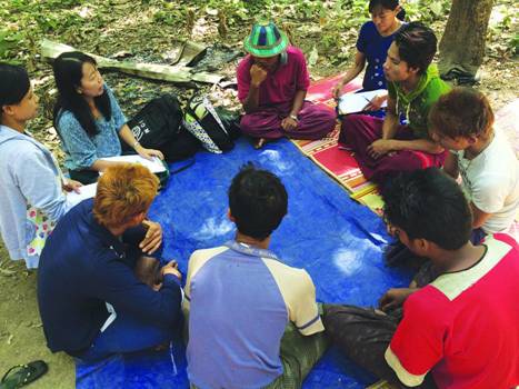 Một nhóm người cạo mủ cao su đang thử nghiệm quần áo tẩm chất xua ở bang Mon, Myanmar