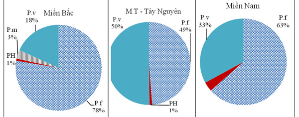 Theo NIMPE, năm 2016 cả nước có 4.161 KSTSR chủ yếu là P. falciparum (55,83%), P. vivax (42,06%). Cơ cấu KSTSR có sự khác nhau giữa các vùng miền Bắc (P. falciparum 77,44%; P. vivax 18,21%; P. malariae 3,33%, phối hợp FV 0,77% và 1 P.ovale 0,25%). Miền Trung-Tây Nguyên (P. falciparum 48,78%; 1.273 P. vivax 50,16%; 1 P. malariae 0,04%, phối hợp FV 1,02%). Nam Bộ-Lâm Đòng (P. falciparum 63,50%; P. vivax 32,93%, phối hợp FV 3,57%).