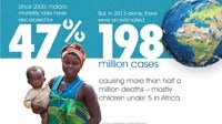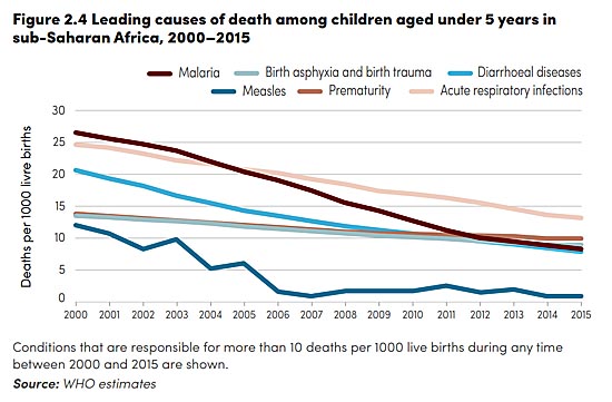 Trong khi đó, sốt rét vẫn còn là nguyên nhân chính gây tử vong ở trẻ em, cứ 2 phút thì có 1 trẻ em tử vong, những tiến bộ đạt được trong việc giảm tử vong ở trẻ em dưới 5 tuổi là rất đáng kể, đặc biệt ở tiểu vùng Sahara châu Phi.