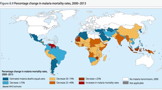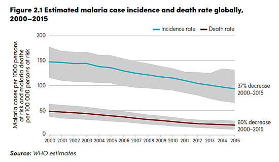 Có khoảng 106 quốc gia và vùng lãnh thổ xảy ra lan truyền sốt rét trong năm 2000, trong đó có 57 quốc gia ước tính đã giảm hơn 75% số ca mắc sốt rét. Sự suy giảm đáng kể tỷ lệ mắc và tỷ lệ tử vong đã xảy ra trên phạm vi toàn cầu (hình 2.6). Ước tính có 57 quốc gia đến từ 2 nguồn thông tin. Trước tiên, 106 quốc gia xảy ra lan truyền sốt rét trong năm 2000, thì có 67 quốc gia đã nộp số liệu bệnh nhân sốt rét được chăm sóc tại các cơ sở y tế, điều này hoàn toàn đẩy đủ và phù hợp để đánh giá đáng tin cậy xu hướng trong giai đoạn 2000-2014.