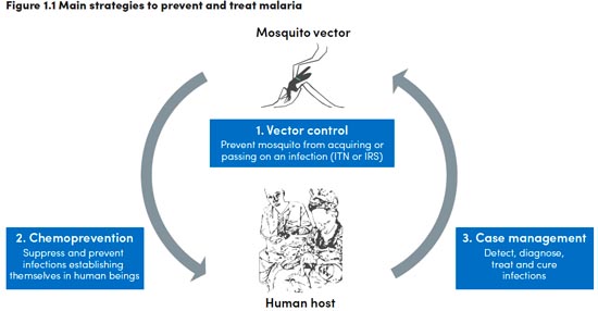 Các biện pháp can thiệp chính được tóm tắt ở đây và thảo luận chi tiết trong dưới đây, các vec tơ (làm giảm lan truyền ký sinh trùng từ người sang muỗi và sau đó từ muỗi sang người), điều này đạt được chủ yếu thông qua việc sử dụng màn ngủ tẩm hóa chất diệt côn trùng (insecticide-treated mosquito nets_ITNs) hoặc phun tồn lưu trong nhà (indoor residual spraying_IRS); hóa dự phòng sốt rét (trong đó ngăn chặn nhiễm giai đoạn máu ở người) và quản lý ca bệnh (trong đó bao gồm chẩn đoán và điều trị nhiễm bệnh sớm).