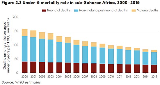 Tỷ lệ tử vong trẻ em dưới 5 tuổi đã giảm 48% ở các quốc gia lưu hành sốt rét ở tiểu vùng Saharan châu Phi trong gian đoạn 2000-2015. Trong năm 2000, tỷ lệ tử vong trẻ em dưới 5 tuổi ở các quốc gia lưu hành sốt rét là 158/1000 trẻ em sinh ra còn sống dẫn đến 4.3 triệu ca tử vong ở trẻ em dưới 5 tuổi. Trong năm 2015, tỷ lệ tử vong ở trẻ em dưới 5 tuổi đã giảm xuống còn 82 ca tử vong/1000 ca sinh ra còn sống, dẫn đến 2.9 triệu ca tử vong (hình 2.3).