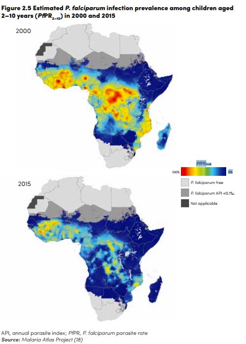 Trong khi lan truyền sốt rét cao phổ biến ở hầu khắp khu vực Trung và Nam Phi trong năm 2000 (với tỷ lệ nhiễm P. falciparum ở trẻ em trong độ tuổi 2-10 tuổi vượt quá 50%), nó giới hạn địa lý trong năm 2015 (hình 2.5). Tỷ lệ dân số sống ở những khu vực nơi tỷ lệ trẻ em trong độ tuổi 2 -10 tuổi vượt quá 50% đã giảm từ 33% (30-37%) xuống còn 9% (5-13%). Thậm chí, với sự gia tăng dân số lớn ở các khu vực lan truyền sốt rét ổn định, mức giảm ở tỷ lệ nhiễm P. falciparum ở trẻ em từ 2-10 tuổi đã dẫn đến giảm 26% số người nhiễm KSTSR, từ trung bình 171 triệu người nhiễm sốt rét trong năm 2000 xuống còn 127 triệu người nhiễm trong năm 2013. Dân số ở những khu vực có lan truyền sốt rét rất thấp (tỷ lệ nhiễm P. falciparum ở trẻ em từ 2-10 tuổi là nhỏ hơn 1%) đã gia tăng gấp 6 lần kể từ năm 2000, đến 121 triệu (khoảng từ 110-133 triệu).