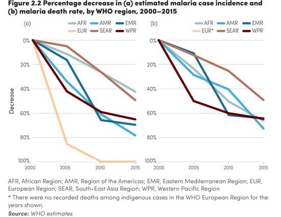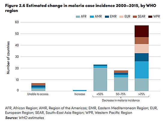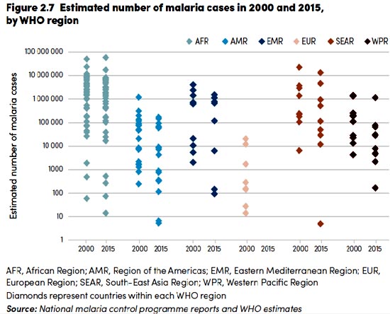 Sử dụng nguồn này, TCYTTG ước tính có 55 quốc gia đã giảm hơn 75% tỷ lệ mắc bệnh trong năm 2015, phù hợp với các mục tiêu của Tổ chức Đẩy lùi sốt rét (RBM) và Đại hội đồng Y tế thế giới (bảng 2.4). Thứ hai, nhiều quốc gia có gánh nặng sốt rét cao ở khu vực châu Phi và Địa Trung Hải nơi mà ca bệnh xác định và báo cáo vẫn hay thay đổi, điều đó không thể đánh giá các xu hướng từ số liệu báo cáo thường xuyên bệnh sốt rét.