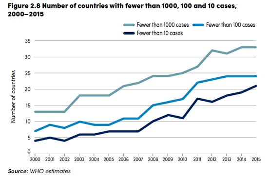 Trong khi chỉ có 13 quốc gia ước tính ít hơn 1.000 ca mắc trong năm 2000, tổng cộng có 33 quốc gia đã ước tínhđạt được cột mốc này trong năm 2015.