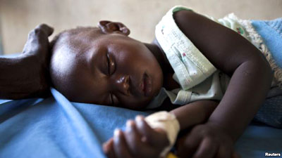 | Một bé gái mắc sốt rét đang nằm nghỉ tại khoa nội của Trung Tâm Chăm Sóc Sức Khỏe Ban Đầu Malualkon, Bang Northern Bahr el Ghazal, Nam Su-đăng, ngày 1/6/2012 |