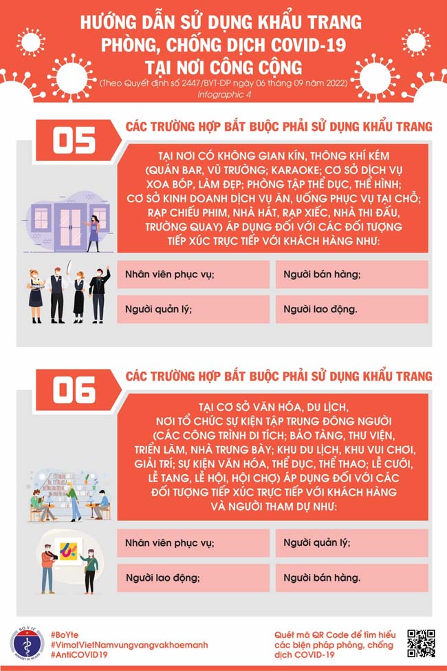 - Tại cơ sở văn hóa, du lịch, những nơi tổ chức sự kiện tập trung đông người: Áp dụng với nhân viên phục vụ, quản lý, người lao động, người bán hàng khi tiếp xúc với khách hàng và người tham dự.