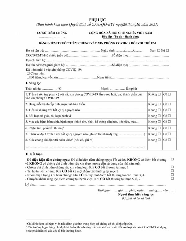 Theo đó, tại quyết định này, Bộ Y tế bổ sung Bảng kiểm trước tiêm chủng vaccine phòng COVID-19 đối với trẻ em được ban hành kèm theo Quyết định 2470/QĐ-BYT ngày 14/6/2019 của Bộ trưởng Bộ Y tế về việc ban hành hướng dẫn khám sàng lọc trước tiêm chủng đối với trẻ em.