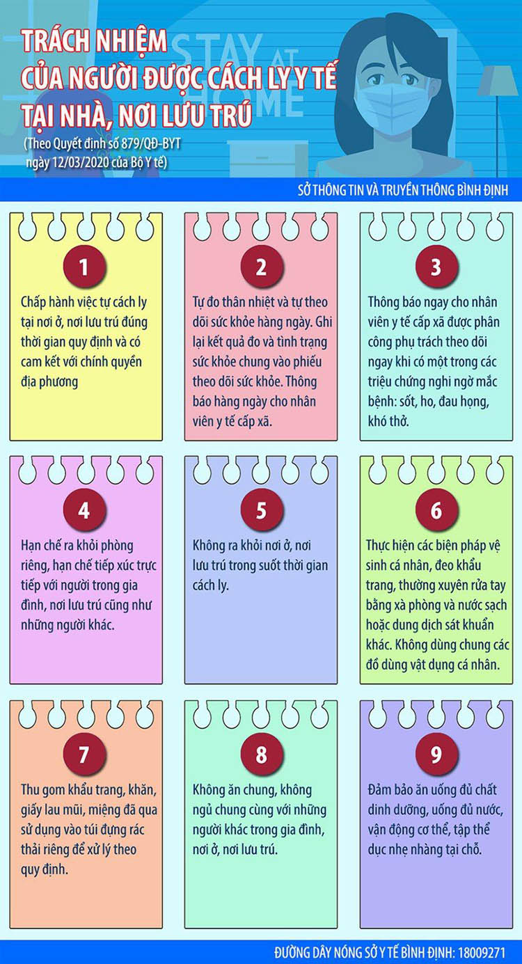 Bộ Y tế yêu cầu người cách ly tại nhà phải chấp hành nghiêm các quy định và thời gian cách ly y tế tại nhà; có cam kết với chính quyền địa phương: Không ra khỏi phòng cách ly; trong suốt thời gian cách ly, không tiếp xúc với người trong gia đình cũng như những người khác.