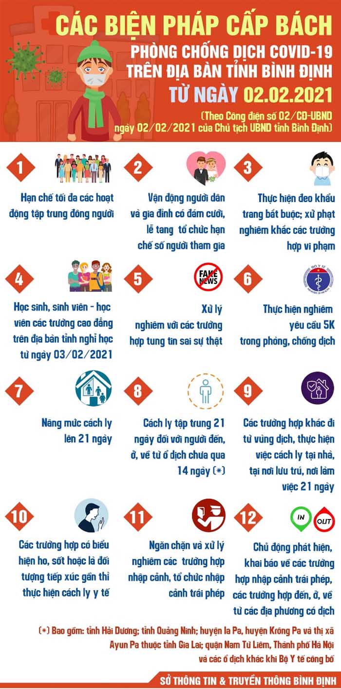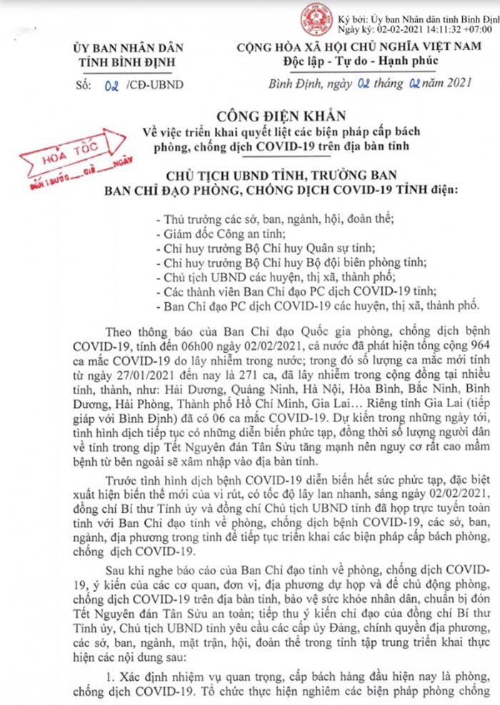 Chiều ngày 02/02/2021, UBND tỉnh Bình Định vừa ban hành Công điện khẩn số 02 về việc triển khai quyết liệt các biện pháp phòng chống dịch COVID - 19 trên địa bàn tỉnh