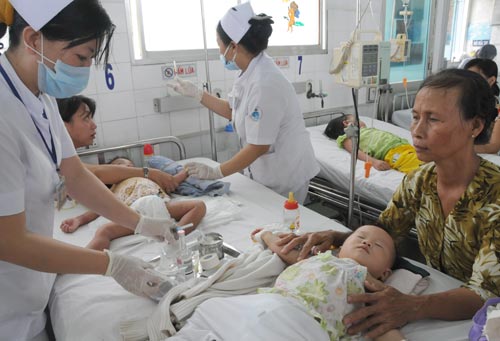 Chăm sóc bệnh nhi mắc bệnh sốt xuất huyết tại Bệnh viện Nhi Đồng 1, TP.HCM - Ảnh: Minh Đức |