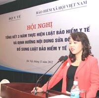 Tại hội nghị, bà Tống Thị Song Hương, Vụ trưởng Vụ Bảo hiểm - Bộ Y tế cho biết, kết quả lớn nhất trong 3 năm triển khai thực hiện Luật BHYT là việc mở rộng phạm vi bao phủ BHYT và đối tượng tham gia BHYT. Nếu như năm 2010, tỉ lệ bao phủ tham gia BHYT là 52 triệu người (chiếm khoảng 60% dân số) thì ước tính hết năm 2012 sẽ có khoảng gần 60 triệu người tham gia BHYT. Đến nay, người tham gia BHYT đã được tiếp cận dịch vụ tất cả các tuyến y tế theo nhu cầu chăm sóc sức khỏe và bệnh tật. Hình thức thanh toán chi phí khám chữa bệnh (KCB) BHYT theo định suất đã được triển khai và từng bước mở rộng. Tuy nhiên, bà Hương cũng cho biết hiện vẫn còn khoảng 35% dân số chưa tham gia BHYT, số người tự nguyện tham gia BHYT còn thấp, đa số người tham gia BHYT là những người mắc bệnh mạn tính, bệnh phải chi phí điều trị cao. Bên cạnh đó, quy định phân chia thành 25 nhóm đối tượng như hiện nay dẫn đến tình trạng 1 người có thể được cấp 2 - 3 thẻ BHYT mà không kiểm soát được. Để từng bước giải quyết những bất cập này, nhằm đảm bảo lộ trình BHYT toàn dân, chia sẻ tại hội thảo, bà Hương đưa ra kinh nghiệm của nhiều nước trên thế giới và khu vực đã cho thấy, việc tham gia theo hộ gia đình là một cách thức tối ưu để thực hiện BHYT toàn dân. "Chỉ có người có nguy cơ ốm đau mới mua BHYT. Điều này không phù hợp với ý nghĩa chia sẻ rủi ro của BHYT, ảnh hưởng đến tính bền vững của quỹ.