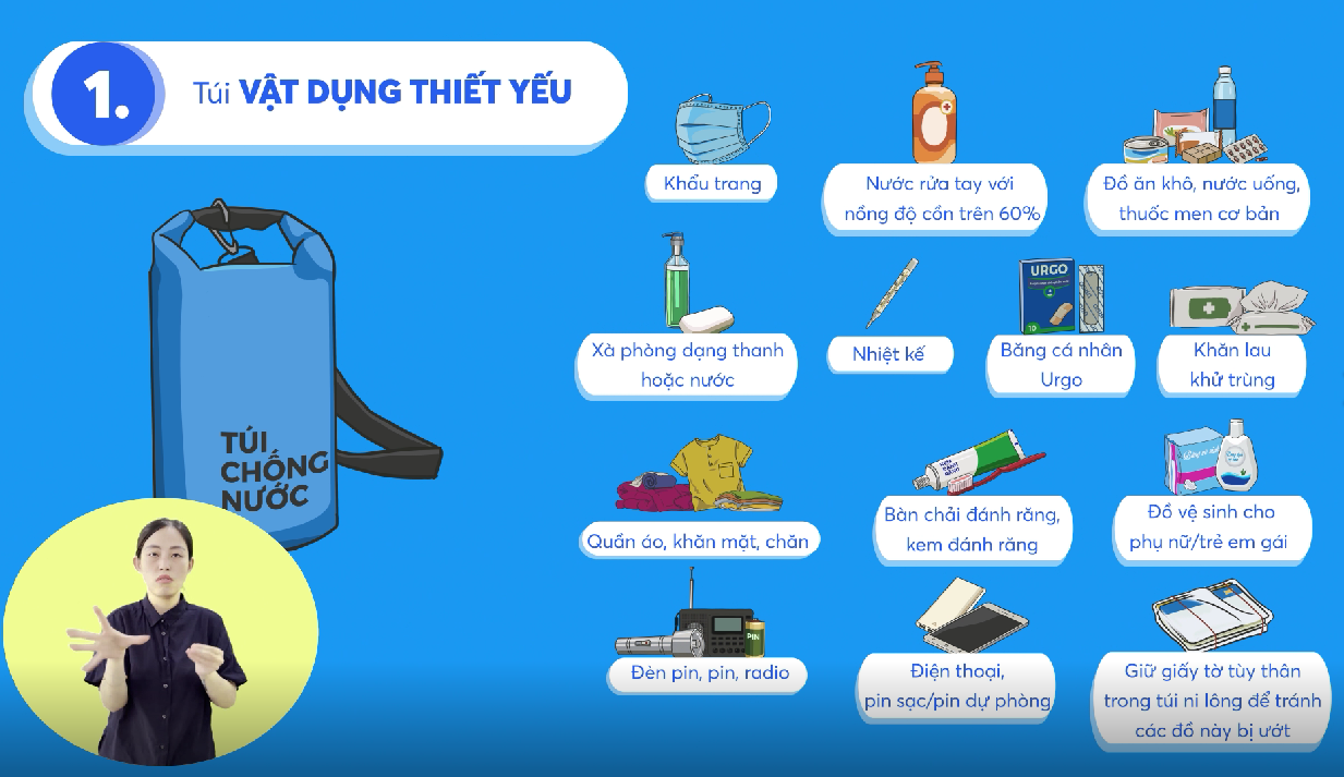 1. Các loại hình thiên tai có nguy cơ cao phải đi sơ tán dân như bão, lũ lụt, lũ quét, sạt lở đất... Trong trường hợp thiên tai và dịch bệnh cùng xảy ra, các gia đình cần chủ động chuẩn bị TÚI VẬT DỤNG THIẾT YẾU chống thấm nước để sẵn sàng sơ tán khi có lệnh của Chính quyền và các cơ quan chức năng, bao gồm:
