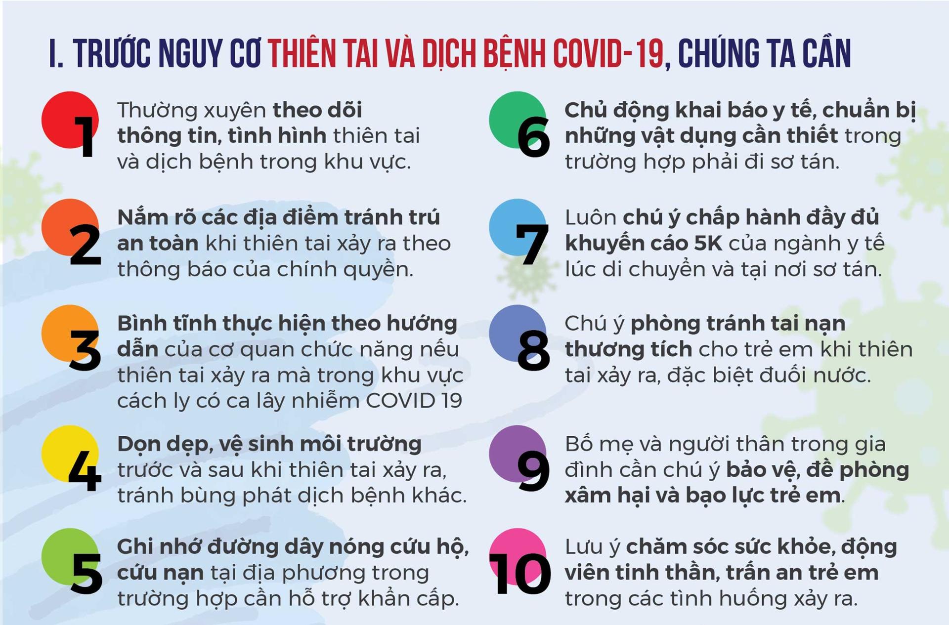 Để ứng phó với thiên tai trong bối cảnh dịch bệnh COVID-19 diễn biến phức tạp, người dân cần chủ động tìm hiểu, ghi nhớ và thực hiện theo các khuyến cáo của Chính quyền và cơ quan chức năng, đảm bảo an toàn tính mạng và tài sản.
