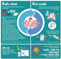 Theo đó, Bộ Y tế thông báo sửa đổi thông điệp 5K thành 2K gồm khẩu trang, khử khuẩn. Cùng đó, Bộ Y tế cũng kêu gọi người dân tiêm vaccine COVID-19 đầy đủ và đúng lịch theo hướng dẫn của Bộ Y tế, kết hợp "thuốc + điều trị + công nghệ + ý thức" trong phòng chống dịch.