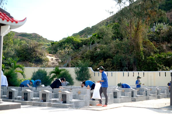 Đoàn viên thanh niên các đơn vị nhặt rác trong khuôn viên nghĩa trang liệt sỹ Nhơn Lý