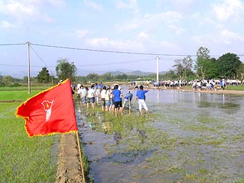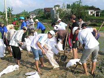 Đoàn viên thanh niên Viện giúp dân vùng ngập úng khắc phục hậu quả đợt ngập lụt, sa bồi thủy phá các phường, xã ngoại thành và giúp dân gieo sạ đón tết tháng 12/2008. |