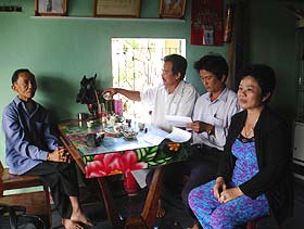 TS. Nguyễn Văn Chương, Phó Viện trưởng Viện Sốt rét-KST-CT Quy Nhơn đang phỏng vấn và cấp thuốc cho người dân tại cộng đồng. |