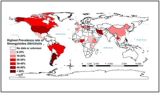 Bản đồ 1. thể hiện tỷ lệ mắc bệnh giunlươn S. stercoralis trên toàn cầu |