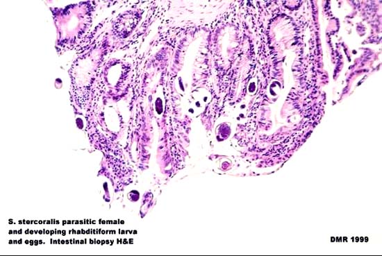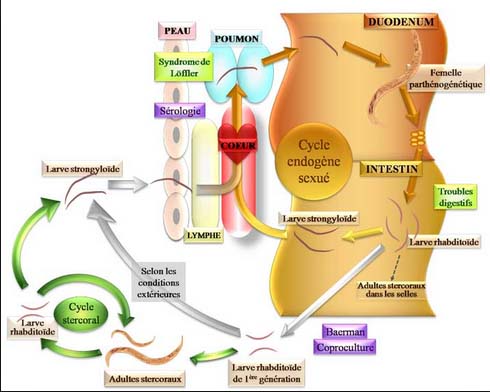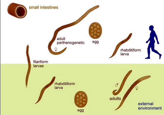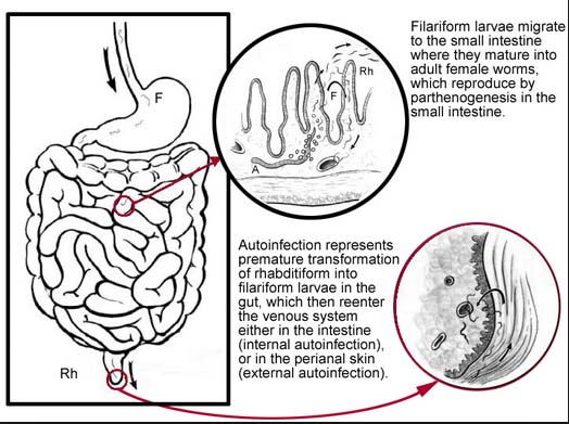Ấu trùng trưởng thành phát triển thành con cái trưởng thành trong ruột non sau hai lần lột xác và con cái đẻ trứng thông qua con đường sinh sản đơn tính. Những con cái ký sinh này có thể sống lên đến 5 năm để tiếp tục chu kỳ sinh sản của chúng. Trứng nở trong ruột thành ấu trùng không nhiễm dạng rhabditiform, ấu trùng không nhiễm này theo phân ra bên ngoài môi trường để tiếp tục giai đoạn sống tự do trong đất. Các ấu trùng bài tiết trong phân theo đó tạo thành yếu tố chính để chẩn đoán nhiễm trong phòng thí nghiệm và cũng chịu trách nhiệm cho tái nhiễm sau khi chuyển thành ấu trùng lây nhiễm dạng filariform.