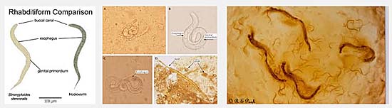 Ấu trùng giun lươn S. stercoralis được bài tiết ra trong phân, và việc phát hiện chúng có thể không liên tục. Ấu trùng thường được bài tiết theo phân khoảng 1 tháng sau khi xâm nhập da. Trứng của ký sinh trùng không thường xuyên được tìm thấy trong phân; thay vào đó, chúng nở ngay lập tức thành ấu trùng trong ruột, và ấu trùng được thải cùng với phân và trải qua giai đoạn phát triển dị dưỡng ở trong đất. Nhiễm S. fuelleborni ở trẻ em, trứng rụng chứ không phải ấu trùng trong phân và có thể dễ dàng chẩn đoán bằng kỹ thuật soi kính hiển vi.