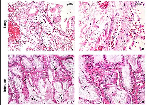 Nhiễm ở người đòi hỏi phải có ấu trùng dạng filariform xâm nhập vào da hoặc các niêm mạc hoặc tái nhiễm hoặc nhiễm từ đất thông qua con đường phân miệng. Tại những vị trí mà ấu trùng xâm nhập vào, ấu trùng thường gây ra xuất huyết ban, tiếp theo là ngứa dữ dội, phù nề và tình trạng tắt ngẽn. Ấu trùng di chuyển thông qua hệ bạch huyết, tỉnh mạch nhỏ đến tuần hoàn phổi và gây xuất huyết ở mao mạch phổi. Ấu trùng thực hiện theo cách của chúng ngoài ra đi vào khoảng không túi phổi và gây ra phản ứng viêm liên quan đến bạch cầu ái toan xâm nhập chấm dứt trong viêm phổi Ấu trùng thực hiện theo cách của họ xa hơn vào không gian ổ răng và gây ra phản ứng viêm liên quan đến bạch cầu ái toan xâm nhập chấm dứt trong viêm phổi. Cuối cùng, ấu trùng bò lên đường hô hấp và nuốt sau đó chúng đến ruột.