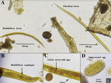A) Ấu trùng Rhabditform có thể nìn thấy phần xung quanh sinh dục (khung vuông) và ống miệng ngắn (mũi tên).