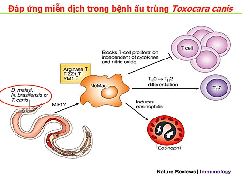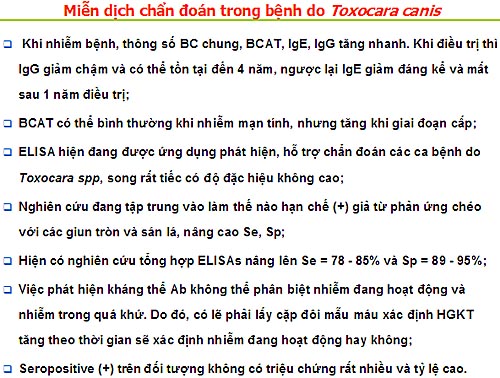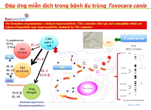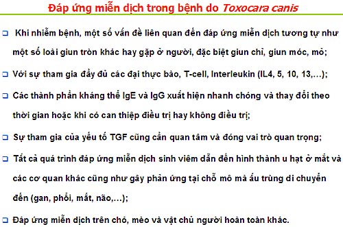 Một số điểm liên quan đến miễn dịch đối với bệnh ấu trùng/ giun đũa Toxocara canis/ catiNền tảng phân tử cơ bản về sự xâm nhập và nhận ra khi nhiễm Toxocara canis gần đây cũng đã được một nhóm nghiên cứu (Maizels RM và cs., 2012) tại Viện miễn dịch và nghiên cứu nhiễm trùng, đại học Edinburgh, Ashworth Laboratories, Anh. Nghiên cứu chỉ ra rằng Toxocara canis là các khác thường do ấu trùng sống sót nhiều năm trong các mô của nhiều loại vật chủ có xương sống khác nhau, cũng như phát triển đến trưởng thành trong đường ruột của các vật chủ chính là chó. Bệnh ở người gây ra bởi giai đoạn ấu trùng xâm nhập vào hệ cơ, não và mắt và odw chế miễn dịch dường như không hiệu quả để loại bỏ nhiễm trùng. Các ấu trùng T. canis sống sót có thể góp phần vào hai chiến lược phân tử bởi ký sinh trùng.