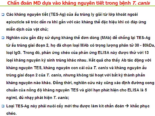 Các kháng thể đơn dòng được sinh ra tái hoạt với kháng nguyên tiết của T. cati với bản chất tự nhiên của protein nhưng không với các kháng nguyên T. cati khác. Một kháng thể đơn dòng được làm tăng chống lại kháng nguyên tiết của ấu trùng giai đoạn T. cati. Không thấy phản ứng chéo với các kháng nguyên của Ascaris suum, Dirofilaria immitis, Trichostrongylus orientalis, ấu trùng đóng kén của Trichinella spiralis và ấu trùng metacercariae của Centrocestus armatus. Hệ thống đủ nhạy để phát hiện 5 ng/mL của kháng nguyên lưu hành trong huyết thanh. Các kết quả này chỉ ra một hệ thống phát hiện kháng nguyên mới cung cấp một phương pháp hữu ích cho chẩn đoán hội chứng VLMs và OLMs gây ra bởi T. cati và như một biện pháp lấp khoảng trống các tồn tại ở các công cụ chẩn đoán huyết thanh học khác.
